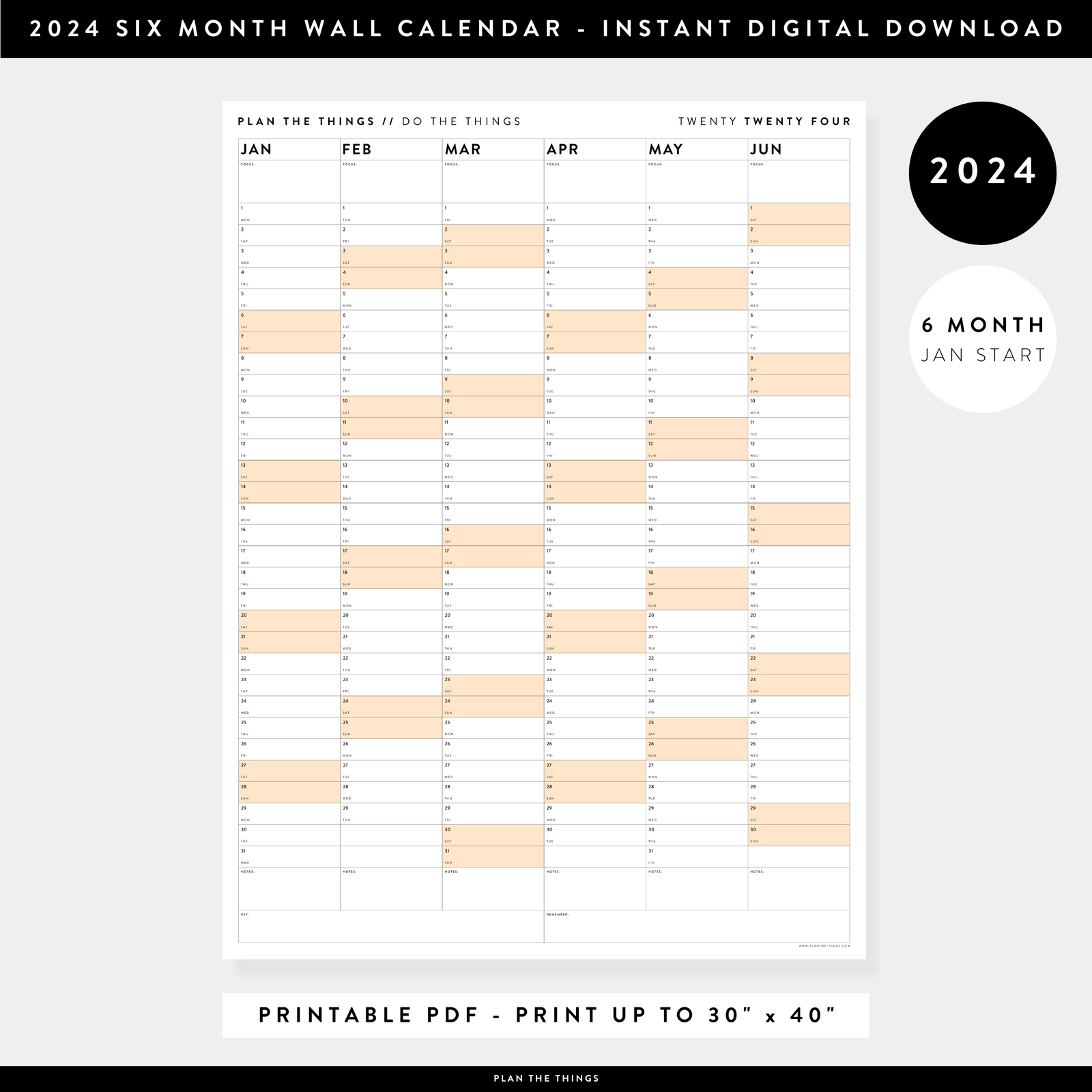 Yearly Calendar 2024 , January to June digital, Printable Etsy